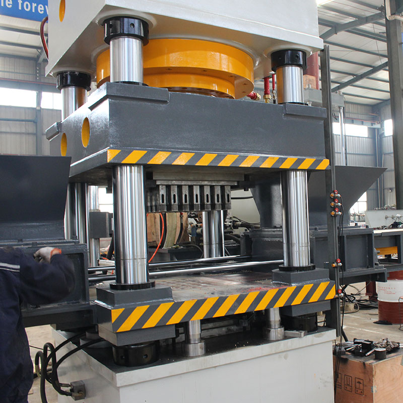 牛羊盐砖油压机为四梁四柱结构,配备专用的移粉和液压比例浮动成型技术,使制品成型密度得到有效控制。装料、成型、脱模三位置的机械挡块定位及无级调整机构,确保制品尺寸稳定可调